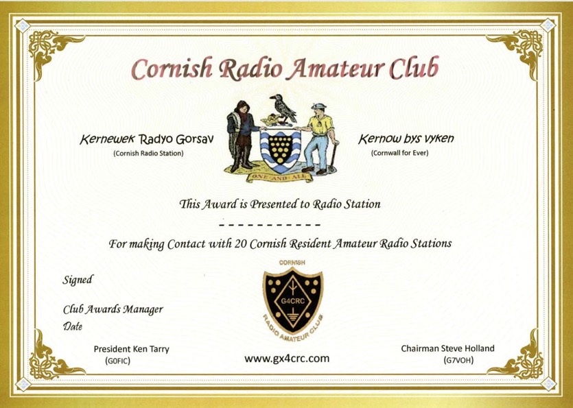This award can be earned by making contact with 20 Cornish Stations that are residing in Cornwall, South West UK. The contacts can be made on any band and using any mode. However, it must be a direct station to station contact without the use of repeaters, satellites or internet based modes such as Echolink, DMR, D-Star or Fusion. These modes are NOT allowed.